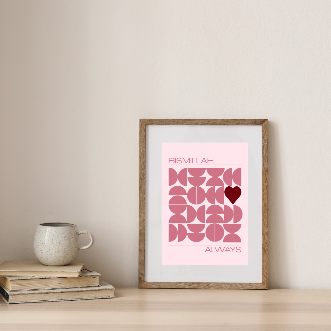 Un design moderne et raffiné qui allie formes géométriques harmonieuses et la douceur d’un cœur central, symbole de spiritualité et d’amour. Au centre, l’inscription élégante “Bismillah Always” apporte une touche esthétique et spirituelle, parfaite pour embellir ton intérieur.