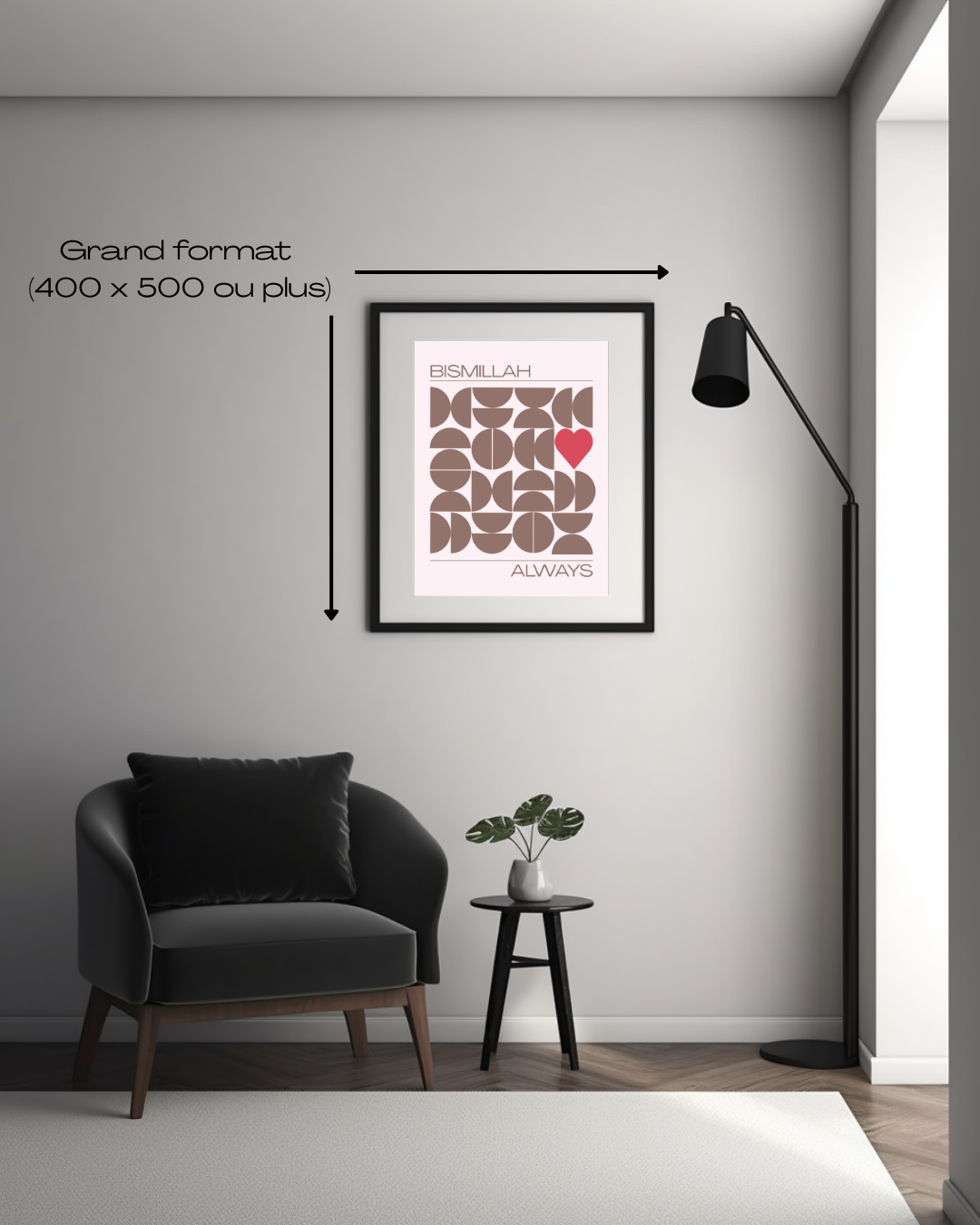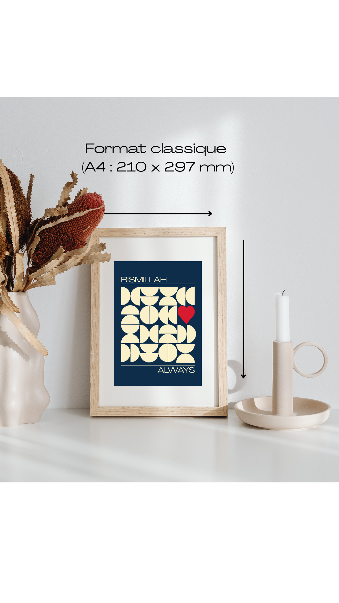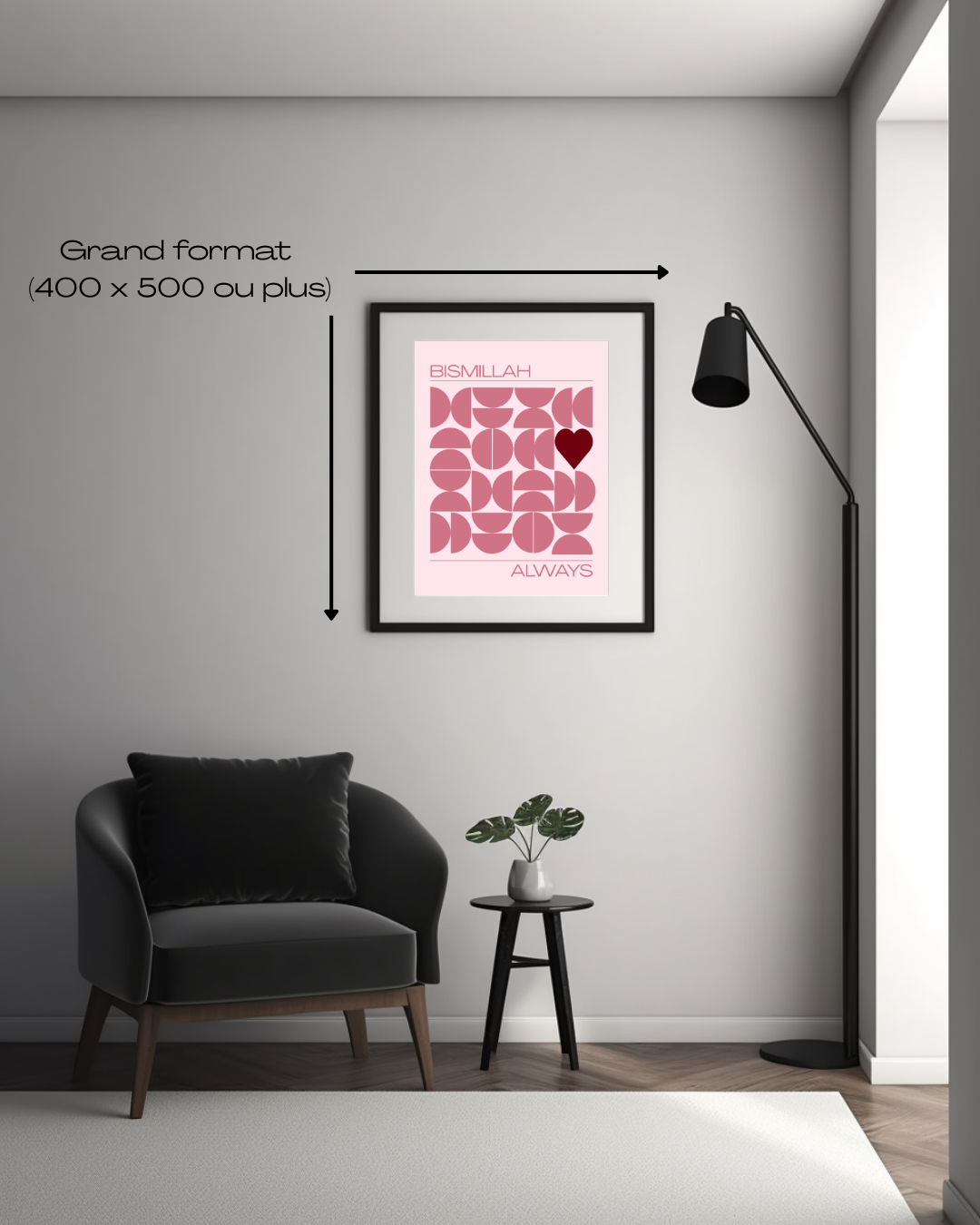 Un design moderne et raffiné qui allie formes géométriques harmonieuses et la douceur d’un cœur central, symbole de spiritualité et d’amour. Au centre, l’inscription élégante “Bismillah Always” apporte une touche esthétique et spirituelle, parfaite pour embellir ton intérieur.