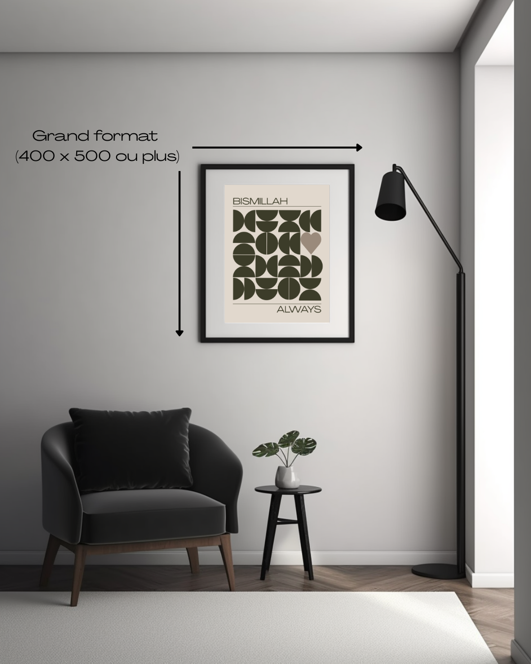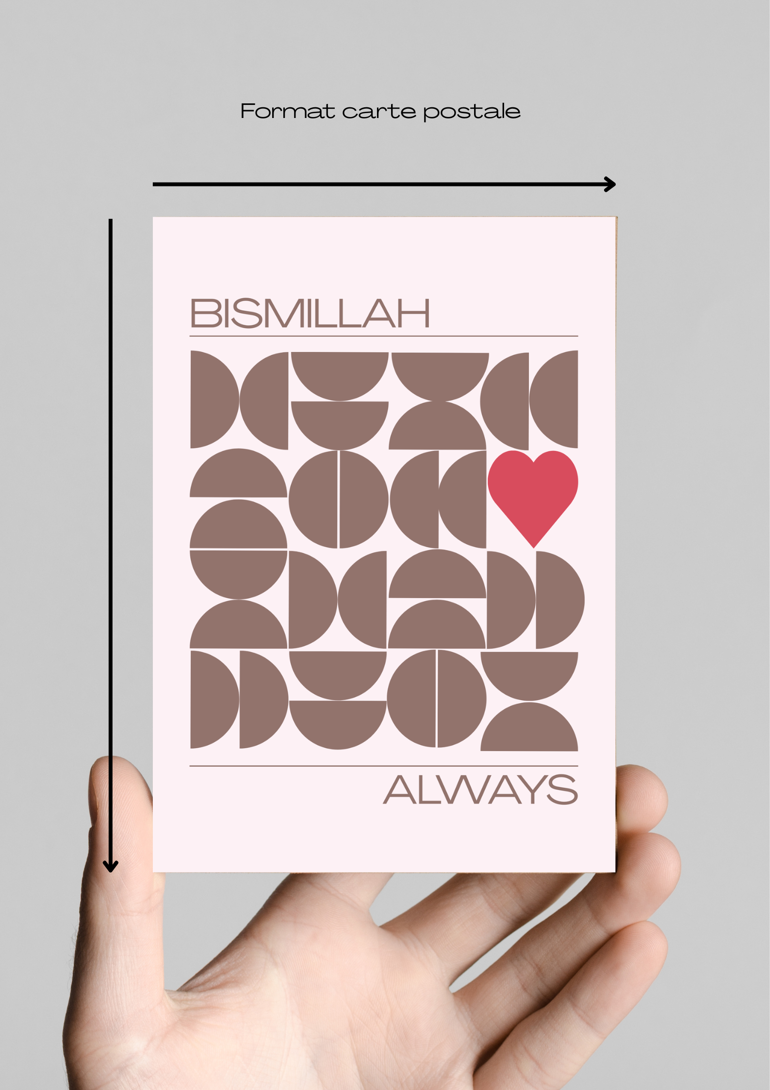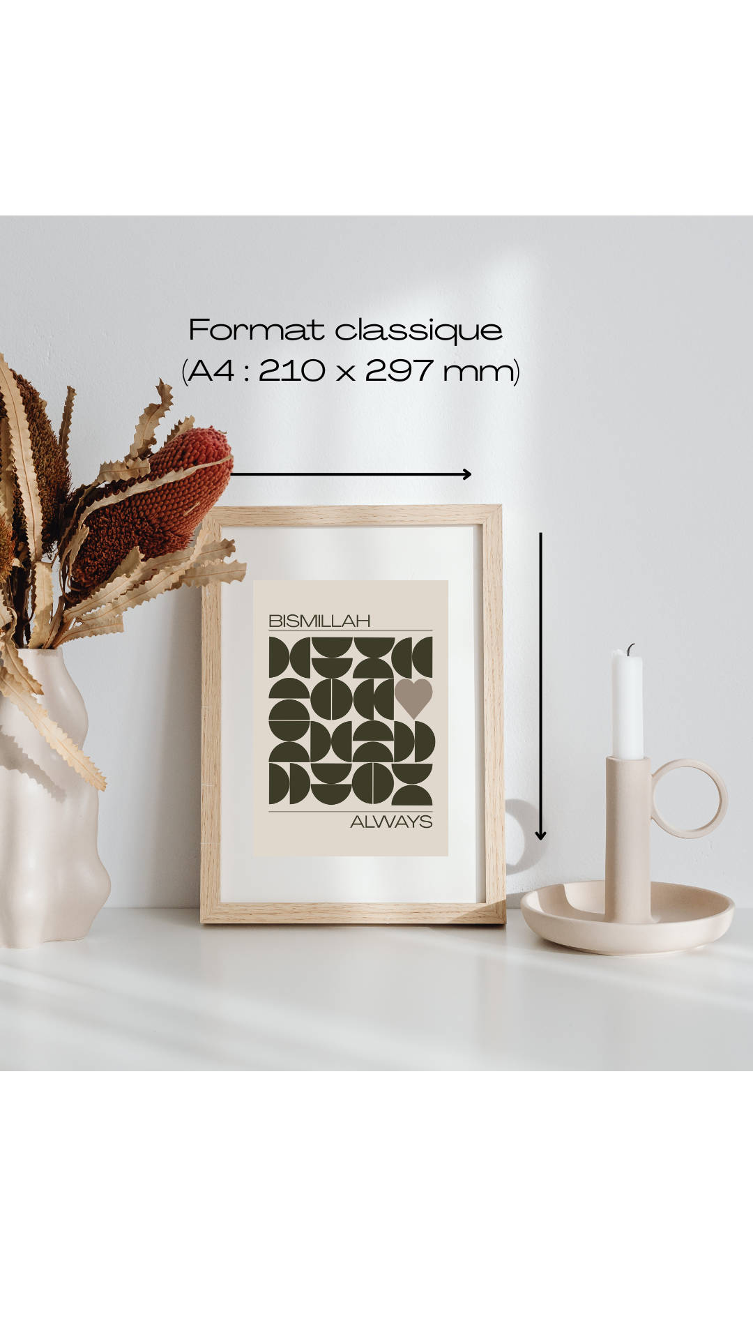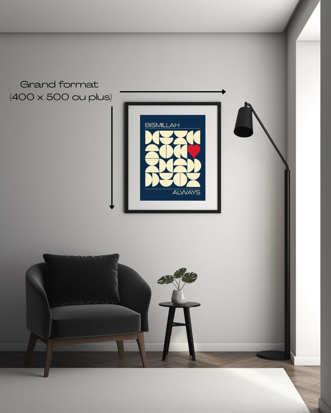 Un design moderne et raffiné qui allie formes géométriques harmonieuses et la douceur d’un cœur central, symbole de spiritualité et d’amour. Au centre, l’inscription élégante “Bismillah Always” apporte une touche esthétique et spirituelle, parfaite pour embellir ton intérieur.