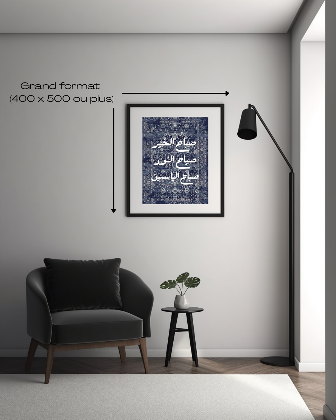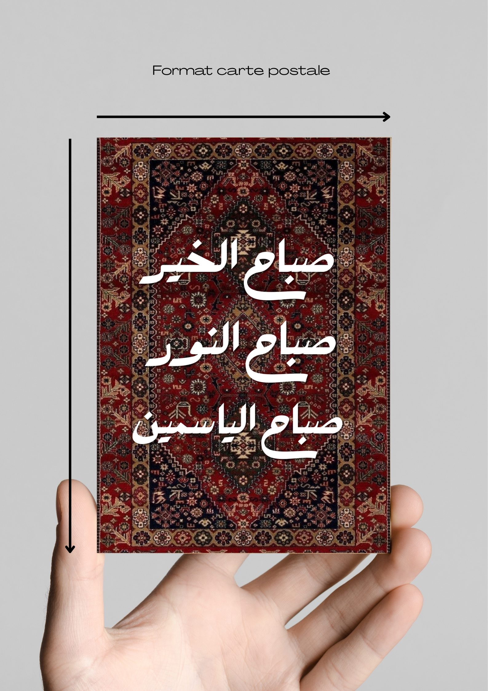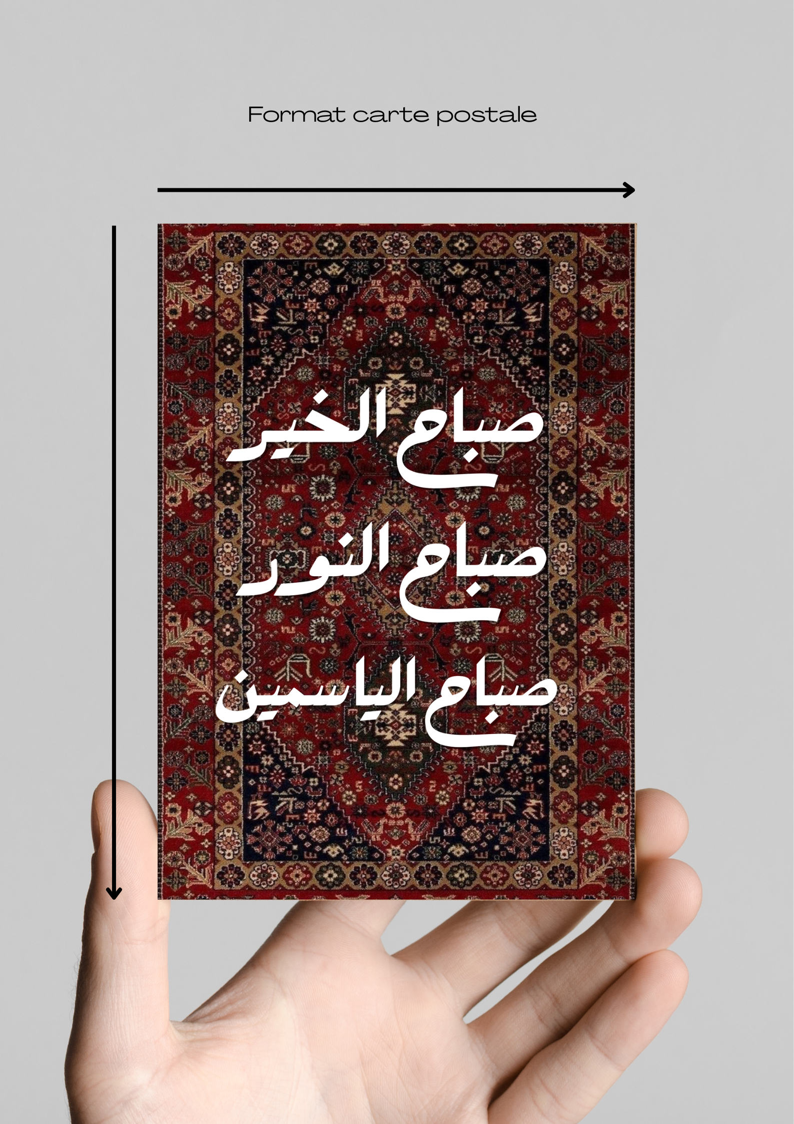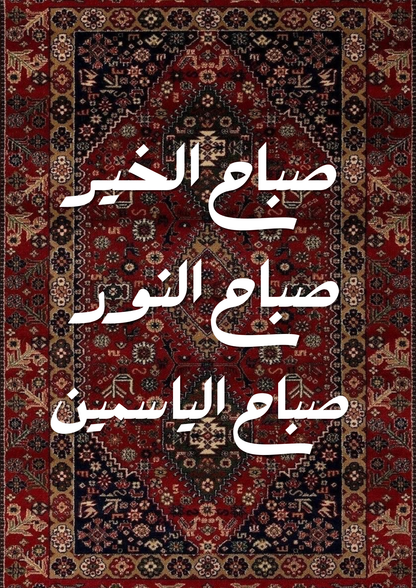 Une création qui mêle tradition et modernité : en arrière-plan, un tapis oriental aux motifs riches et délicats, inspiré de l’artisanat iranien et arabe, décliné en trois palettes de couleurs au choix.